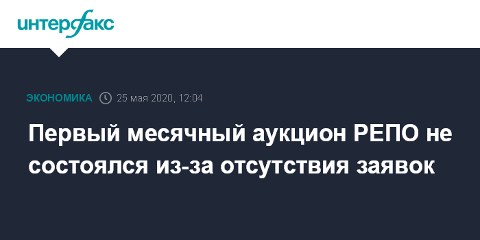 Москва. 25 мая. INTERFAX.RU - Аукцион прямого РЕПО на срок 28 дней не состоялся в связи с отсутствием заявок, сообщил в понедельник ЦБ РФ.