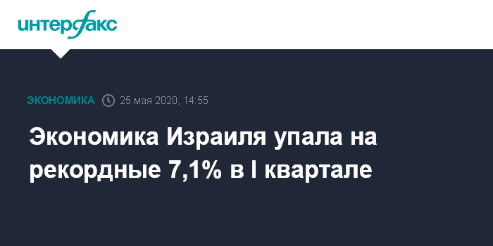 Москва. 25 мая. INTERFAX.RU - Экономика Израиля упала в первом квартале на 7,1% в годовом выражении на фоне пандемии коронавируса COVID-19, свидетельствуют официальные данные.