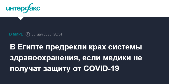 Москва. 25 мая. INTERFAX.RU - Ведущий профсоюз египетских медиков предупредил, что если правительство не обеспечит врачей достаточными средствами защиты от коронавируса, то системе здравоохранения Египта будет грозить катастрофа, сообщает ливанское издание Daily Star.