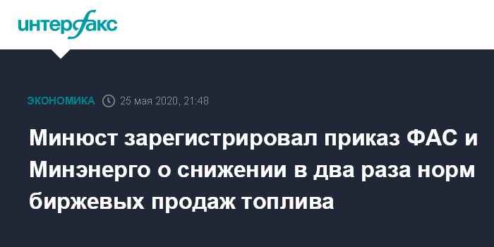 Москва. 25 мая. INTERFAX.RU - Министерство юстиции 25 мая зарегистрировало корректировку совместного приказа Федеральной антимонопольной службы (ФАС) и Минэнерго о временном снижении в два раза нормативов биржевых продаж нефтепродуктов, сообщается на портале правовой информации.