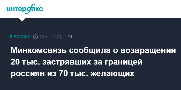 Москва. 26 мая. INTERFAX.RU - Более 20 тысяч граждан, оставшиеся за границей из-за отмены авиасообщения в связи с коронавирусом, возвращены на родину, сообщил глава Минкомсвязи Максут Шадаев.