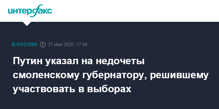 Москва. 27 мая. INTERFAX.RU - Президент РФ Владимир Путин поддержал намерение Алексея Островского баллотироваться на пост губернатора Смоленской области, но обратил внимание на недочеты в его работе в отдельных отраслях.