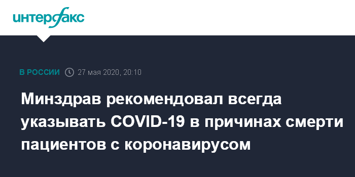 Москва. 27 мая. INTERFAX.RU - Минздрав РФ рекомендует всегда указывать в причинах смерти человека коронавирус, если он был выявлен у пациента, хотя не был основной причиной.
