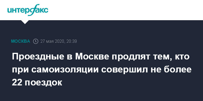 Москва. 27 мая. INTERFAX.RU - Срок действия проездных документов на общественный транспорт в Москве будет продлен тем, кто в период самоизоляции совершил не более 22 поездок, следует из указа мэра Москвы Сергея Собянина, опубликованного на сайте столичной мэрии.