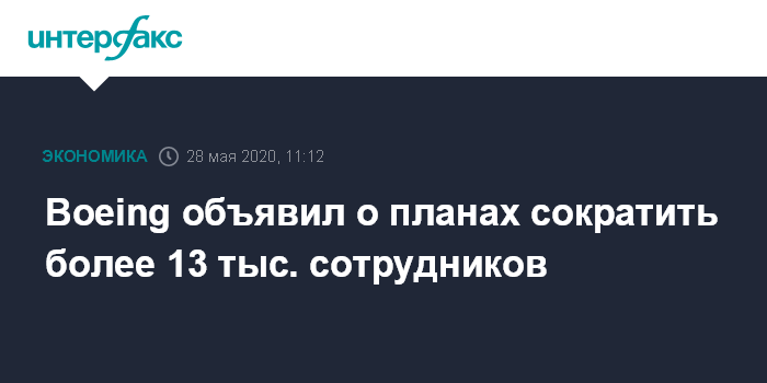 Москва. 28 мая. INTERFAX.RU - Американский концерн Boeing Co., один из крупнейших мировых производителей авиационной, космической и военной техники, сообщил о намерении сократить более 13 тыс. сотрудников.