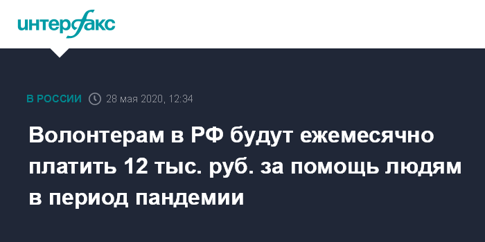 Москва. 28 мая. INTERFAX.RU - Премьер-министр Михаил Мишустин сообщил о дополнительных ежемесячных выплатах в размере 12 тыс. руб. волонтерам и социальным работникам, оказывающим помощь в период пандемии коронавируса.