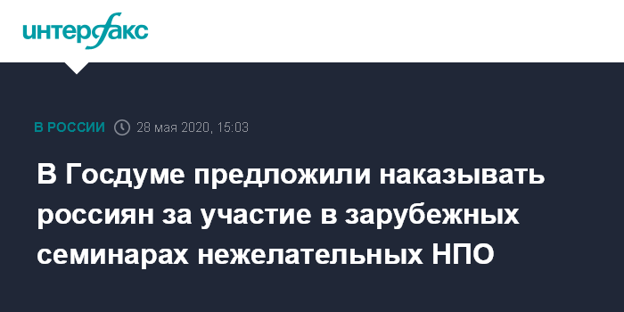 Москва. 28 мая. INTERFAX.RU - Комиссия Госдумы по иностранному вмешательству в дела России предложила ввести административную ответственность для россиян за участие в зарубежных мероприятиях организаций, которые в России признаны нежелательными. Об этом сообщил глава комиссии Василий Пискарев.
