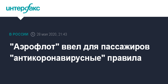 Москва. 28 мая. INTERFAX.RU - "Аэрофлот" сообщил, что ввел новые правила по обслуживанию пассажиров, в соответствии с методическими указаниями Росавиации и Роспотребнадзора. Теперь на борт пассажиры смогут пройти только в масках и перчатках и только если у них нет повышенной температуры.