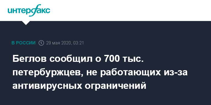 Москва. 29 мая. INTERFAX.RU - В Санкт-Петербурге возможность работать в период ограничений, введенных из-за пандемии COVID-19, сохраняют около 2,4 млн жителей города, более 700 тысяч сейчас не работают, сообщил губернатор Александр Беглов в эфире телеканала "78".