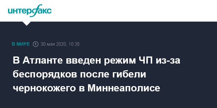 Москва. 30 мая. INTERFAX.RU - Губернатор американского штата Джорджия Брайан Кемп заявил о введении в районе Атланты режима чрезвычайного положения на фоне беспорядков, которые вспыхнули в этом городе после гибели в понедельник, 25 мая, в Миннеаполисе афроамериканца Джорджа Флойда.