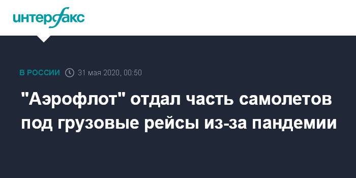 Москва. 30 мая. INTERFAX.RU - "Аэрофлот" отдал 18 пассажирских самолетов под грузовые рейсы из-за отмены пассажирских перевозок во время пандемии COVID-19, говорится в июньском бортовом журнале авиакомпании.