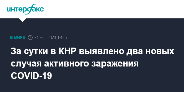 Москва. 31 мая. INTERFAX.RU - В материковом Китае за истекшие сутки зарегистрированы два новых случая активного протекания вызванных коронавирусом заболеваний, выявлено три бессимптомных больных, сообщил Госкомздрав КНР на своем официальном сайте.