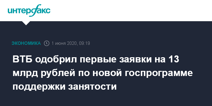Москва. 1 июня. INTERFAX.RU - ВТБ сообщил, что одобрил первые заявки на 13 млрд рублей своим клиентам в рамках новой госпрограммы поддержки занятости.