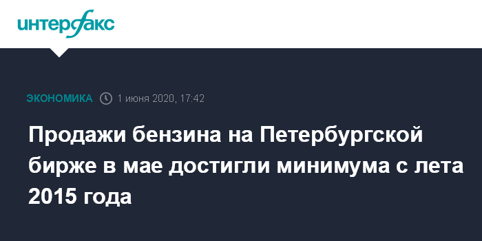 Москва. 1 июня. INTERFAX.RU - Продажи бензина на Санкт-Петербургской международной товарно-сырьевой бирже (СПбМТСБ) в мае 2020 года упали по сравнению с этим же месяцем 2019 года на 16,7%, до 471,05 тыс. тонн, сообщает биржа.