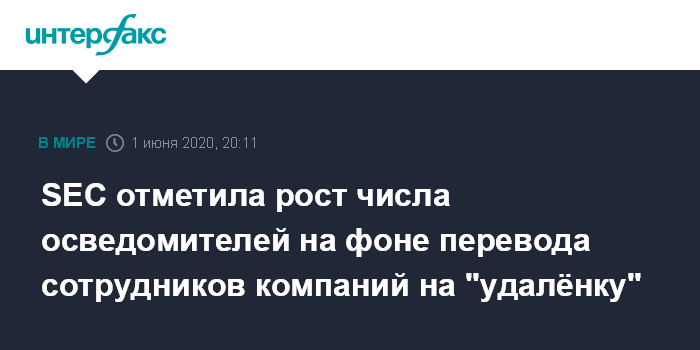 Москва. 1 июня. INTERFAX.RU - Побочным эффектом пандемии коронавируса, вынудившей многие компании перевести сотрудников на удаленный режим работы, отправить людей в отпуск без сохранения заработной платы или даже уволить, стал рост числа обращений в Комиссию по ценным бумагам и биржам (SEC) с информацией о корпоративных нарушениях.