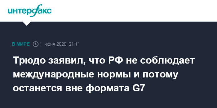 Москва. 1 июня. INTERFAX.RU - Премьер Канады Джастин Трюдо в понедельник заявил, что Россия останется вне формата "группы семи", поскольку продолжает не соблюдать международные нормы.