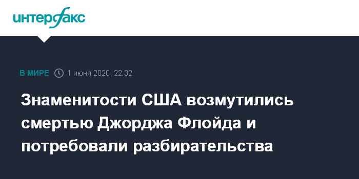 Москва. 1 июня. INTERFAX.RU - Многие западные знаменитости и спортсмены выразили возмущение в связи со смертью афроамериканца Джорджа Флойда после задержания полицией в США, сообщают американские СМИ.
