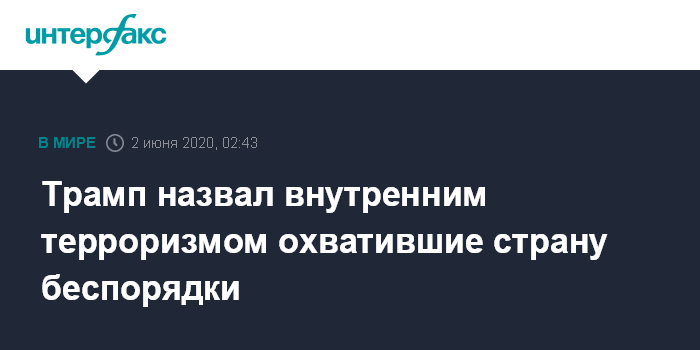 Москва. 2 июня. INTERFAX.RU - Происходящие в США беспорядки следует считать актами терроризма, а не законной формой протеста, заявил президент США Дональд Трамп.