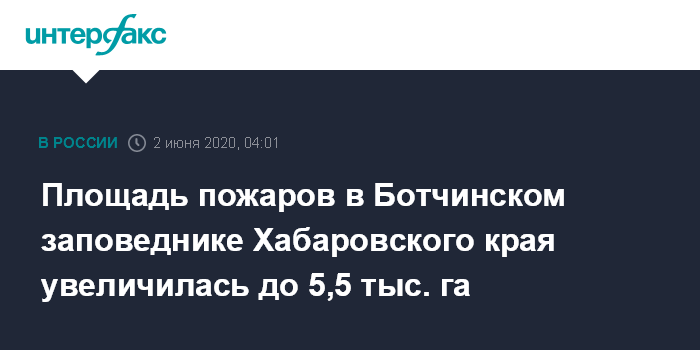 Москва. 2 июня. INTERFAX.RU - Пожары в Ботчинском заповеднике Хабаровского края охватили территорию в 5,5 тыс. га, сообщает во вторник ФБУ "Авиалесоохрана".