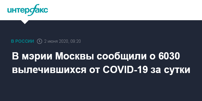 Москва. 2 июня. INTERFAX.RU - В Москве за последние сутки от коронавирусной инфекции вылечились и выздоровели еще 6030 человек, сообщила заммэра города Анастасия Ракова. Днем ранее она сообщила о 3 599 вылечившихся за сутки.