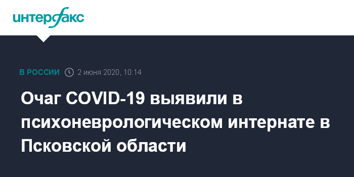 Москва. 2 июня. INTERFAX.RU - Очаг коронавируса зарегистрирован в Моринском психоневрологическом интернате в Дновском районе Псковской области, сообщает региональный оперштаб.