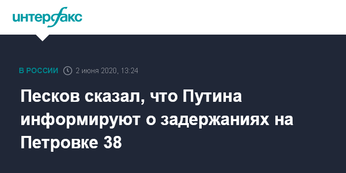 Москва. 2 июня. INTERFAX.RU - Президента Владимира Путина информируют обо всем, в том числе о задержаниях одиночных пикетчиков на Петровке у здания ГУ МВД Москвы, заявил пресс-секретарь главы государства Дмитрий Песков. От комментариев он отказался.