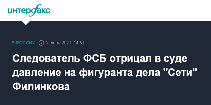 Москва. 2 июня. INTERFAX.RU - Старший следователь УФСБ по Петербургу и Ленинградской области Геннадий Беляев в суде отрицал, что оказывал давление на задержанного по делу "Сети" (запрещена в России) Виктора Филинкова. Еще трех сотрудников ФСБ, которых просила вызвать защита подсудимых, суду допросить не удалось.