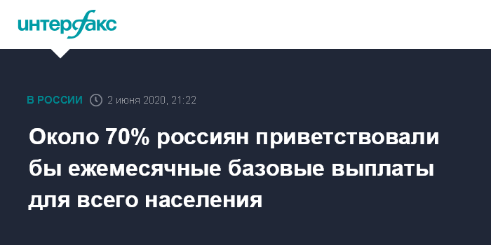 Москва. 2 июня. INTERFAX.RU - Две трети опрошенных граждан РФ (67%) полагают, что российские власти могли бы пойти по пути ЕС, где уже начали рассматривать вопрос о введении для всех граждан стран Евросоюза ежемесячной базовой выплаты, гарантированной государством, свидетельствуют данные опроса Исследовательского центра портала Superjob.ru.