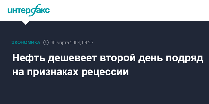 Москва. 30 марта. INTERFAX.RU - Нефть дешевеет второй день подряд на признаках рецессии мировой экономики, которая ведет к снижению спроса на топливо, сообщило агентство Bloomberg.