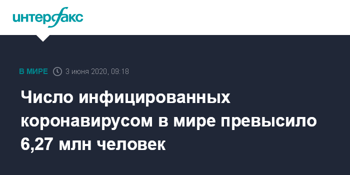 По сообщению портала Worldometer, специализирующегося на статистике, связанной с важнейшими событиями в мире, коронавирусом с начала его распространения в мире заразился 6 371 661 человек, количество смертельных случаев превысило 377 тысяч, излечились 2,9 млн.