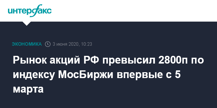 Москва. 3 июня. INTERFAX.RU - Рынок акций РФ открылся в среду дальнейшим ростом цен blue chips вслед за мировыми фондовыми площадками и нефтью (Brent превысила $40 за баррель) на ожиданиях восстановления экономической активности в мире и продления сделки ОПЕК++; индексы МосБиржи и РТС за минуту торгов выросли на 0,6-1,1%, причем первый превысил рубеж 2800 пунктов впервые с 5 марта.