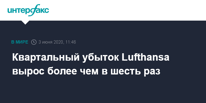 Москва. 3 июня. INTERFAX.RU - В I квартале 2020 года чистый убыток авиакомпании Deutsche Lufthansa AG составил 2,12 млрд евро против 342 млн евро годом ранее.