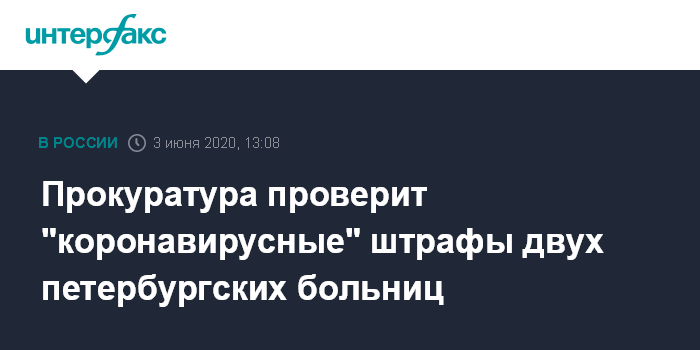 Москва. 3 июня. INTERFAX.RU - Прокуратура Петербурга проверит обоснованность штрафов, которые назначили двум городским больницам за нарушение санитарно-эпидемиологического законодательства в связи с коронавирусом. Об этом сообщила Генпрокуратура.