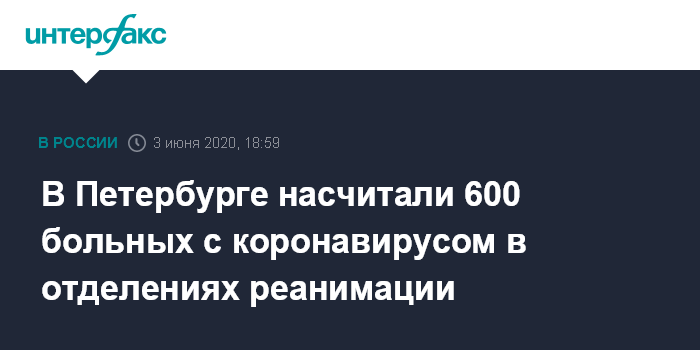 Москва. 3 июня. INTERFAX.RU - В Санкт-Петербурге 600 больных коронавирусом в настоящее время находятся в реанимации, из них 300 человек подключены к аппаратам искусственной вентиляции легких, сообщил председатель городского комитета по здравоохранению Дмитрий Лисовец.