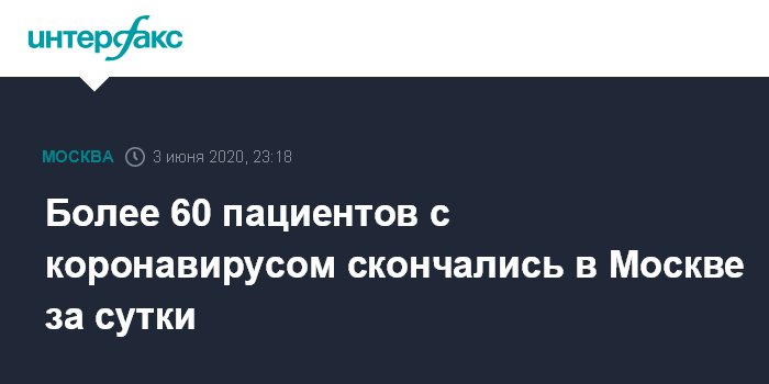 Москва. 3 июня. INTERFAX.RU - Еще 64 пациента с диагнозом пневмония и положительным тестом на коронавирусную инфекцию COVID-19 скончались в Москве за прошедшие сутки, сообщили "Интерфаксу" в столичном оперштабе по контролю и мониторингу ситуации с коронавирусом.