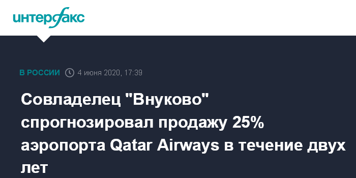 Москва. 4 июня. INTERFAX.RU - Сделка по продаже 25% аэропорта "Внуково" авиакомпании Qatar Airways ожидается в течение двух лет, заявил совладелец, глава совета директоров аэропорта Виталий Ванцев. Он сказал это в онлайн-эфире "Ведомостей" "Как преодолеть кризис? Прямая речь".