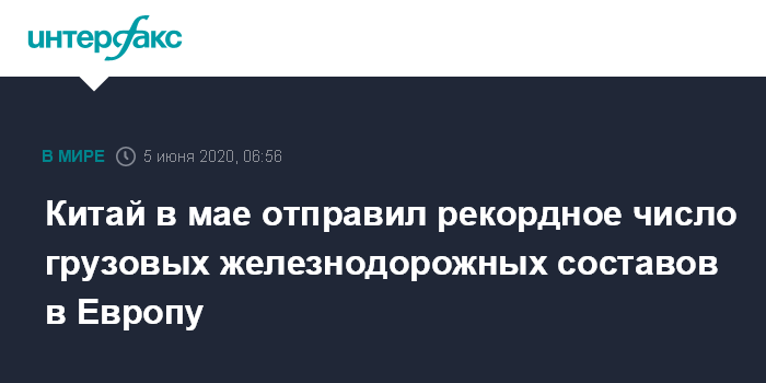 Москва. 5 июня. INTERFAX.RU - В мае текущего года Китай отправил в Европу 1033 контейнерных железнодорожных состава, что на 43% больше в годовом исчислении, сообщили местные СМИ со ссылками на данные Китайкой железнодорожной корпорации.