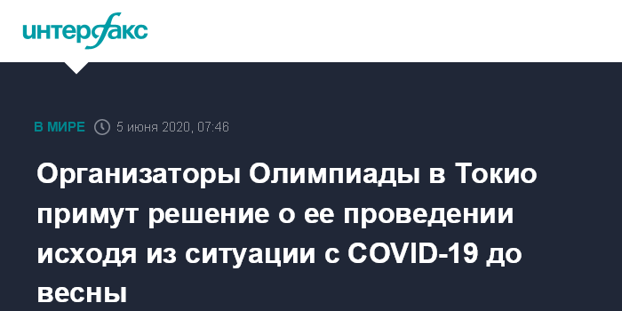 Москва. 5 июня. INTERFAX.RU - Организаторы Олимпийских игр в Токио будут следить за ситуацией с COVID-19 до следующей весны, чтобы принять решение проводить ли игры, сообщают японские СМИ.