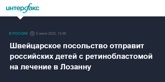 Москва. 5 июня. INTERFAX.RU - Швейцарское посольство в Москве сообщило, что с начала эпидемии помогает российским семьям, в которых есть дети с ретинобластомой - агрессивной формой рака сетчатки. Дипломаты организуют гуманитарные рейсы для отправки этих детей на лечение в Лозанну.