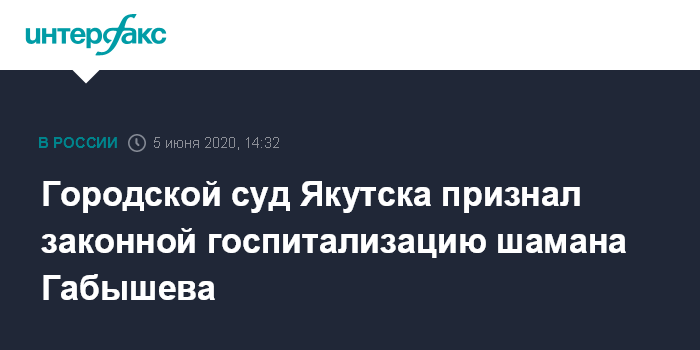 Москва. 5 июня. INTERFAX.RU - Якутский городской суд признал законной принудительную госпитализацию в психиатрическую больницу шамана Александра Габышева, сообщила "Правозащита Открытки". Адвокаты шамана просили признать его помещение в диспансер незаконным и его немедленно освободить.