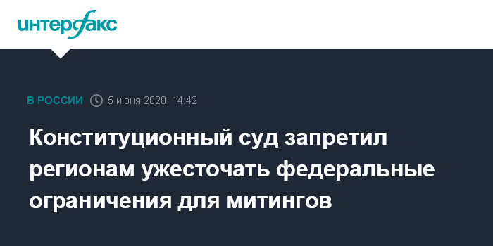 Москва. 5 июня. INTERFAX.RU - Конституционный суд предписал поправить региональные законы о митингах, если введенные ими запреты шире, чем обозначенные в федеральном законодательстве. Это решение суд принял по жалобе трех граждан на закон Самарской области.