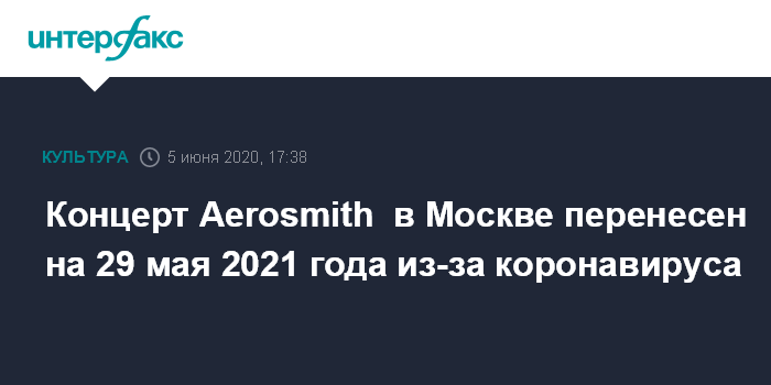 Москва. 5 июня. INTERFAX.RU - Концерт группы Aerosmith в Москве перенесли с 30 июля на 29 мая 2021 года из-за коронавируса. Об этом сообщили организаторы шоу - SAV Entertainment. Шоу планировалось в рамках европейского турне в честь 50-летия группы.