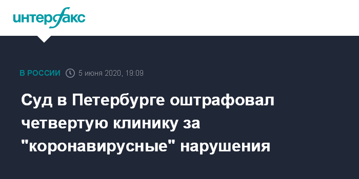 Москва. 5 июня. INTERFAX.RU - Пушкинский суд в Петербурге по требованию Роспотребнадзора оштрафовал на 100 000 рублей детскую поликлинику №49 за нарушения санитарно-эпидемиологического законодательства. Она стала четвертым медицинским учреждением, получившим такой штраф с начала эпидемии.