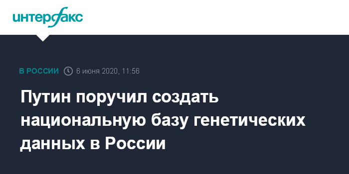 Москва. 6 июня. INTERFAX.RU - Президент РФ Владимир Путин поручил премьер-министру Михаилу Мишустину и директору "Курчатовского института" Александру Благову создать в России национальную базу генетических данных.