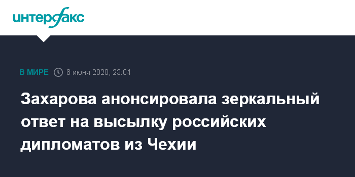 Москва. 6 июня. INTERFAX.RU - Москва зеркально ответит на высылку российских дипломатов из Чехии и учтет этот шаг в выстраивании внешнеполитического курса в отношении этого государства, заявила официальный представитель МИД РФ Мария Захарова.