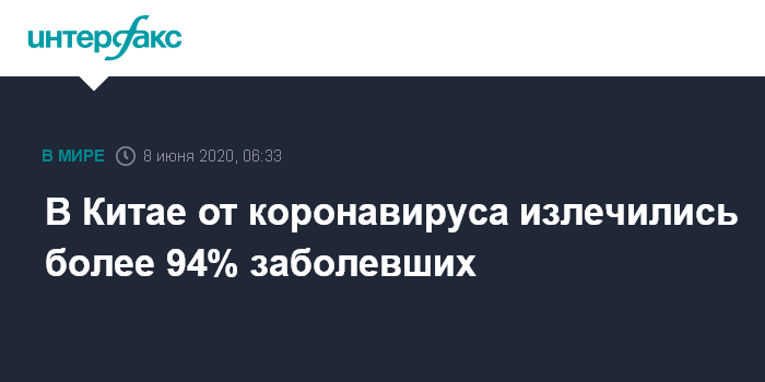 Москва. 8 июня. INTERFAX.RU - С начала эпидемии коронавируса CОVID-19 по конец мая в Китае от связанных с ним заболеваний излечились 78 307 инфицированных, скончались 4 634 человека. Таким образом, удалось вылечить 94,3% больных, смертность составила 5,6%, говорится в выпущенной Госсоветом КНР Белой книге по борьбе с инфекцией.