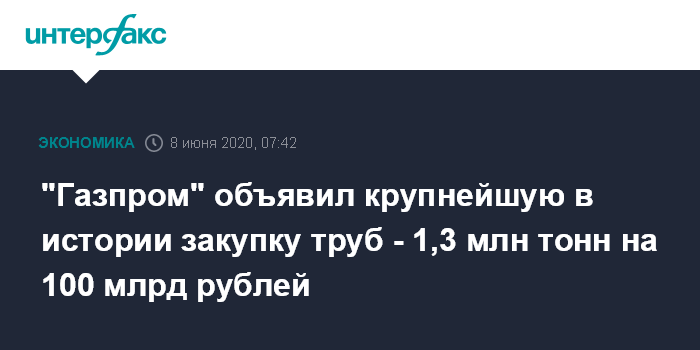 Москва. 8 июня. INTERFAX.RU - ООО "Газпром инвест" объявило крупнейшую в истории корпоративных практик "Газпрома" закупку труб большого диаметра (ТБД) - одним лотом сразу на сотню миллиардов рублей. Это первая крупная закупка труб с начала реформы закупочного блока и перевода его в подчинение зампреда Олега Аксютина.
