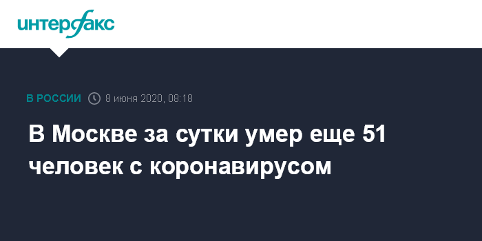 Москва. 8 июня. INTERFAX.RU - В Москве за минувшие сутки умер 51 пациент с положительным тестом на коронавирусную инфекцию, сообщили в городском оперативном штабе.