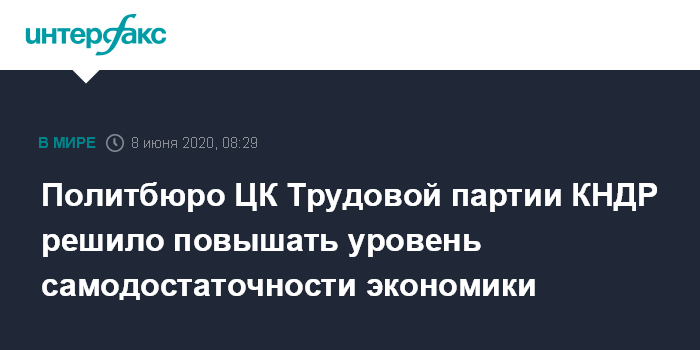 Москва. 8 июня. INTERFAX.RU - Политбюро ЦК Трудовой партии Кореи на проходившем два дня заседании рассмотрело вопросы обеспечения самодостаточности национальной экономики, сообщило информагентство ЦТАК.