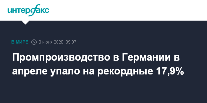 Москва. 8 июня. INTERFAX.RU - В апреле объем промышленного производства в Германии рухнул к марту на 17,9%, свидетельствуют данные Министерства экономики и труда ФРГ. Это максимальные темпы снижения с начала ведения расчетов в 1991 году.